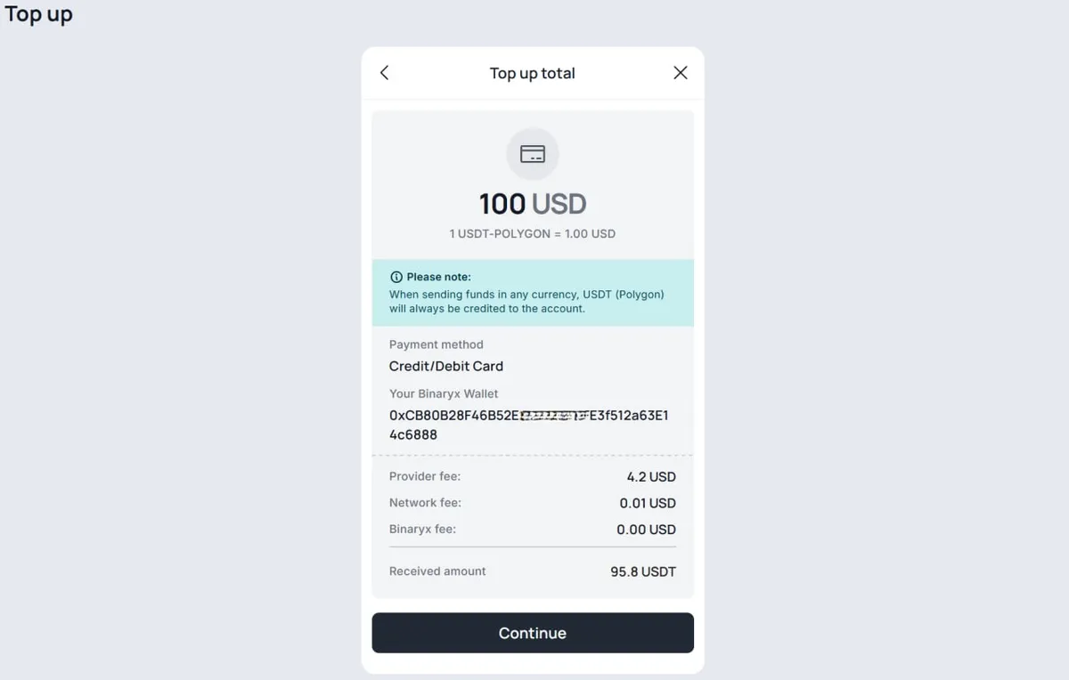 After email confirmation, specify the payment amount (note that this is not equal to the final funding amount) and click "Continue." It's important to remember that Paybis charges a fee for exchanging fiat currency to $USDT. Additionally, you should account for the transaction fee on the Polygon blockchain. Binaryx does not charge any additional fees.