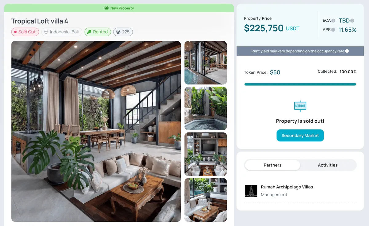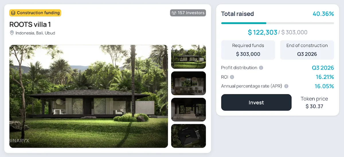 - $5,000 in Kammora Living Rental Villa in Bali: This rental property offers a 12% annual percentage return (APR). With an initial investment of $5,000, you could earn $600 in the first year. While it’s currently sold out, you could still purchase tokens from other users on the Binaryx P2P market.