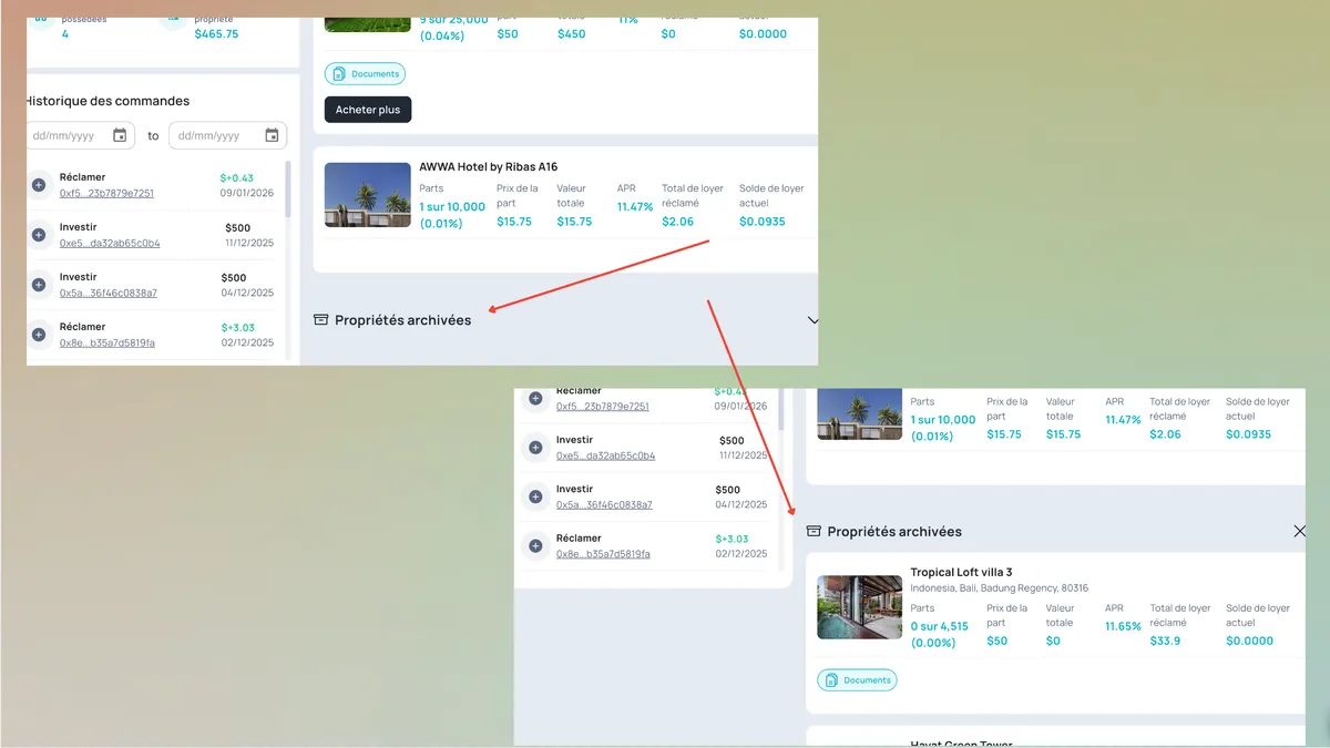 - Les propriétés avec un solde de tokens nul sont automatiquement déplacées vers l'archive.