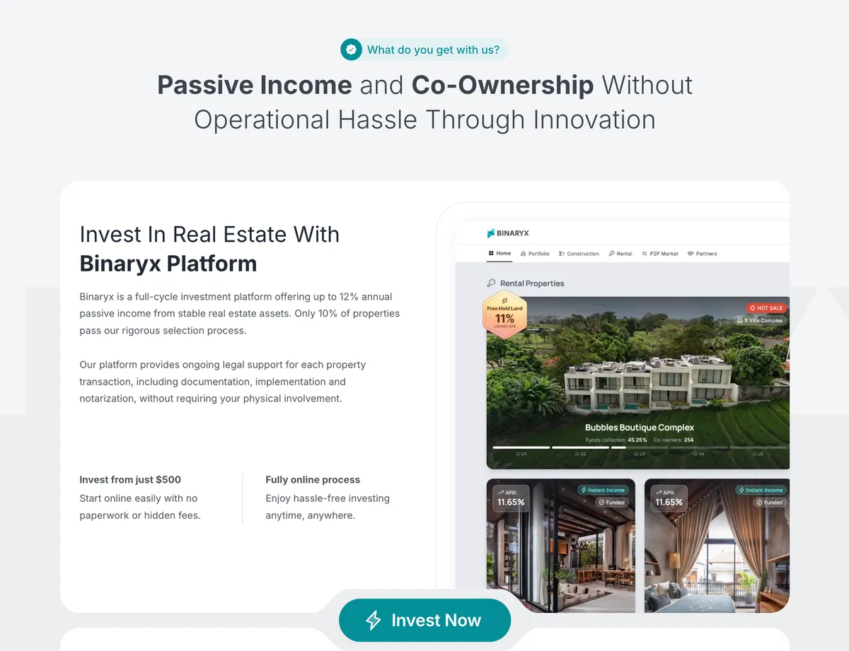Avec Plateforme Binaryx, vous pouvez investir dans l'immobilier fractionné avec seulement 100$ et gagner un revenu passif dès le premier jour. Explorez les opportunités dès aujourd'hui et faites le premier pas vers la propriété immobilière, sans les obstacles traditionnels.