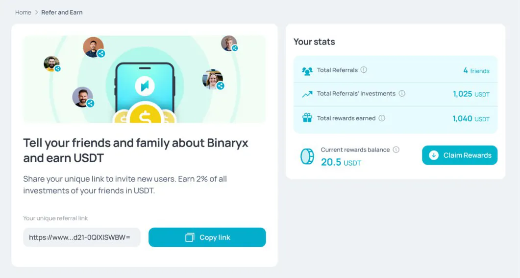 Новости от команды разработки. Сейчас мы создаём полноценную реферальную программу для Binaryx Marketplace, которая позволит вам зарабатывать USDT, если ваши друзья инвестируют в недвижимость на Binaryx. Всё, что нужно — поделиться реферальной ссылкой с друзьями и убедиться, что они её используют при инвестировании.