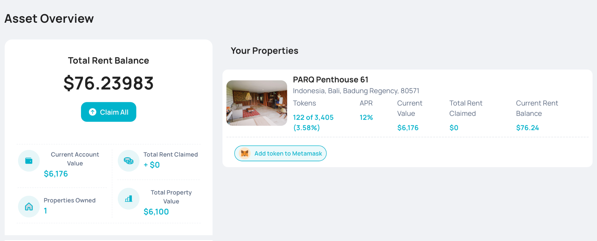 Let’s say the property is worth $100k, and you’ve bought tokens for $1k. That means you own 1% of the property. Every month, you will receive 1% of rent paid by the tenant. And if the property’s value grows by 10% within a year ($10k), the value of your tokens will also grow by $100.