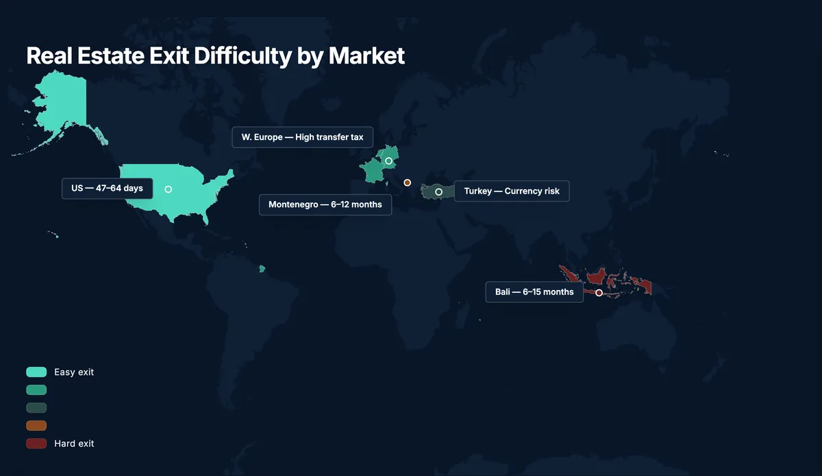 Время на продажу. По данным Zillow, среднее время продажи дома в США составляет от 47 до 62 дней от выставления на продажу до закрытия сделки — и это на самом ликвидном рынке недвижимости в мире. HomeLight сообщает, что в конце 2025 года дома в среднем находились на рынке 64 дня до перехода под контракт, а ещё 41 день требовался для закрытия сделки. На менее ликвидных международных рынках сроки существенно растут: на Бали средняя продажа виллы занимает от шести месяцев до года. В Черногории ситуация аналогична.