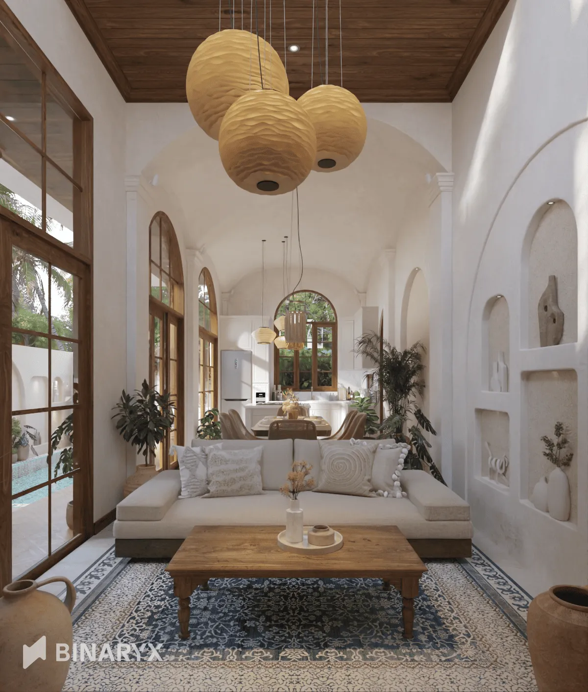 Высокий потолок с открытым пространством делает помещение просторным и воздушным, а открытые деревянные балки вдохновлены испанскими гасиендами. Подвесные лампы из банановой бумаги дают теплое, естественное свет. Мебель из тикового дерева с натуральной отделкой соединяет индонезийское ремесленное мастерство с испанским стилем планировки комнаты. В комнате также есть узорный ковер, плитка Tegel Kunci (20×20 см) и римский гранит (60×60 см, Dolerite Beige) для изысканной отделки.