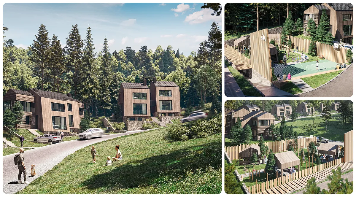 Резиденції витримані в автентичному архітектурному стилі шале — з широкими похилими дахами, глибокими карнизами та натуральним дерев'яним оздобленням, що органічно вписується в навколишній гірський ліс.