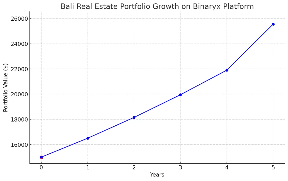 Загалом ваші інвестиції в розмірі 15 000 доларів можуть зрости до 25 550 доларів за п'ять років, що становить 70,3% загальної рентабельності інвестицій. Розподіляючи свої інвестиції на різні типи нерухомості та використовуючи часткову власність, платформа Binaryx дозволяє вам брати участь у процвітаючому ринку нерухомості Балі з меншим ризиком та більш керованою точкою входу. Цей приклад ілюструє, як це працює, але ви можете дізнатися самі на платформі Binaryx.