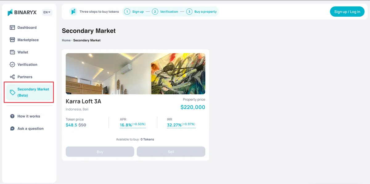 Наразі на вторинному ринку доступний один об'єкт — Karra Loft 3A. Власники цього об'єкта вже можуть продавати там свої токени.
