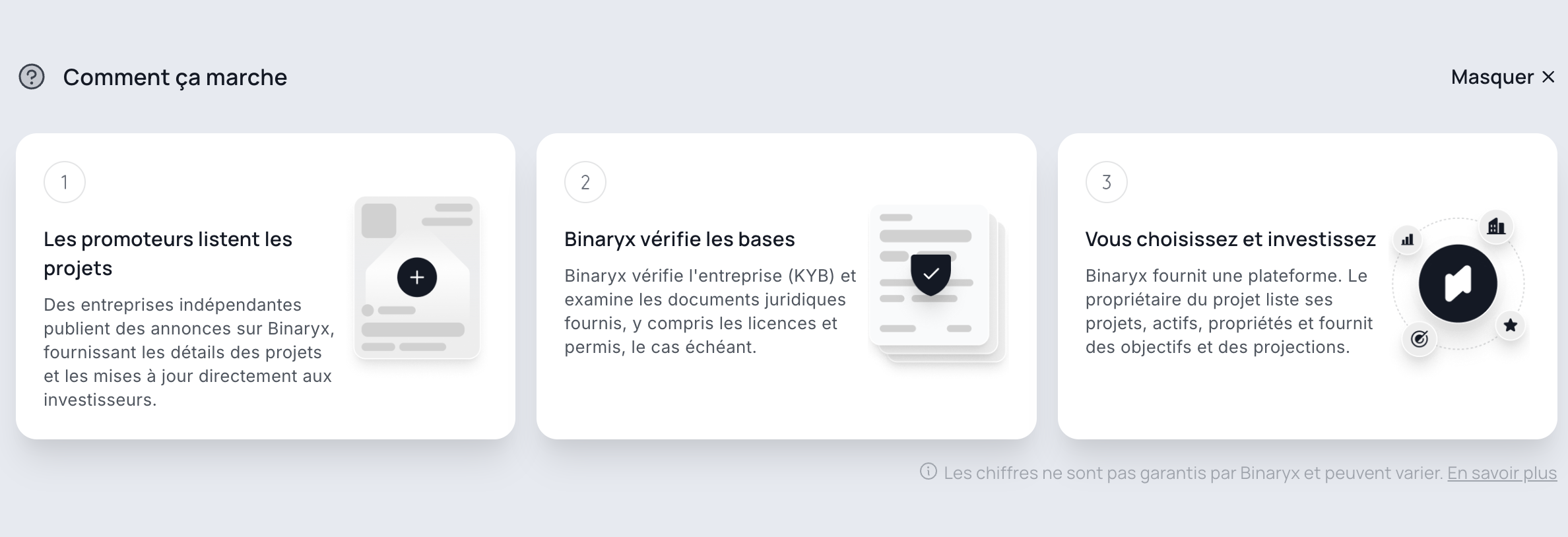 Historiquement, chaque actif passait par un processus de sélection classique et rigoureux orchestré par l'équipe Binaryx. Ce processus incluait une vérification juridique (Legal), une analyse documentaire approfondie, ainsi qu'une due diligence financière et technique. Seuls les projets validés à 100 % par nos experts étaient admis au listing.