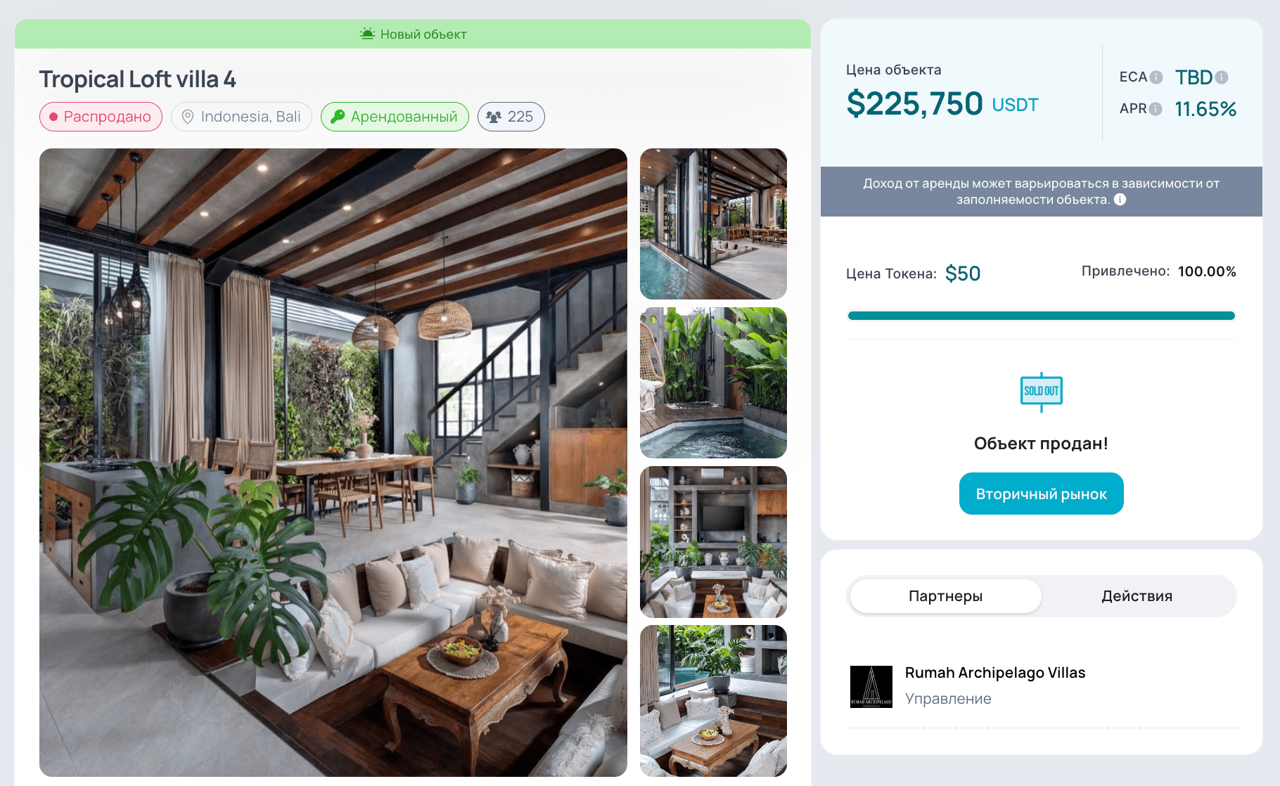 Создайте аккаунт и изучите отобранные объекты — например, арендные виллы на Бали или апартаменты в Турции. Каждый лот содержит ключевую информацию: локацию, доход от аренды и прогнозируемую доходность — всё, чтобы вы могли выбрать то, что соответствует вашим целям.