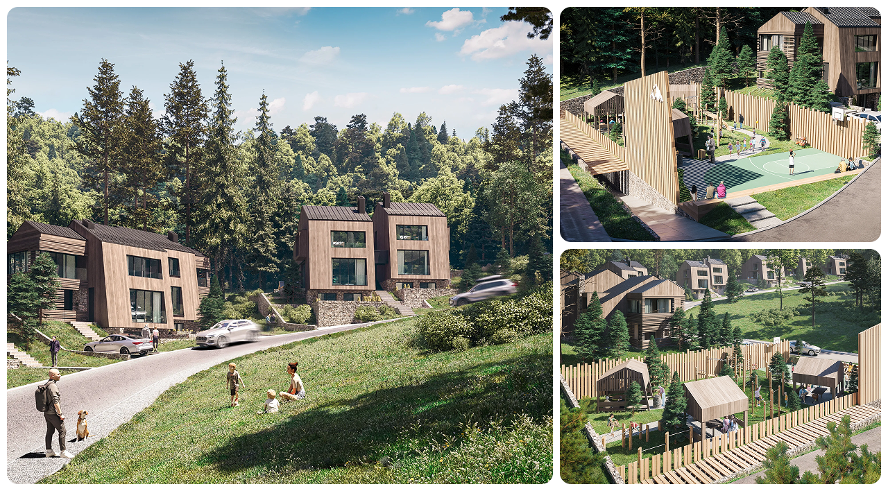 Резиденції збудовані у справжньому стилі шале — широкі скати дахів, масивні карнизи, дерев’яне оздоблення, що органічно вписується у гірський лісовий пейзаж.